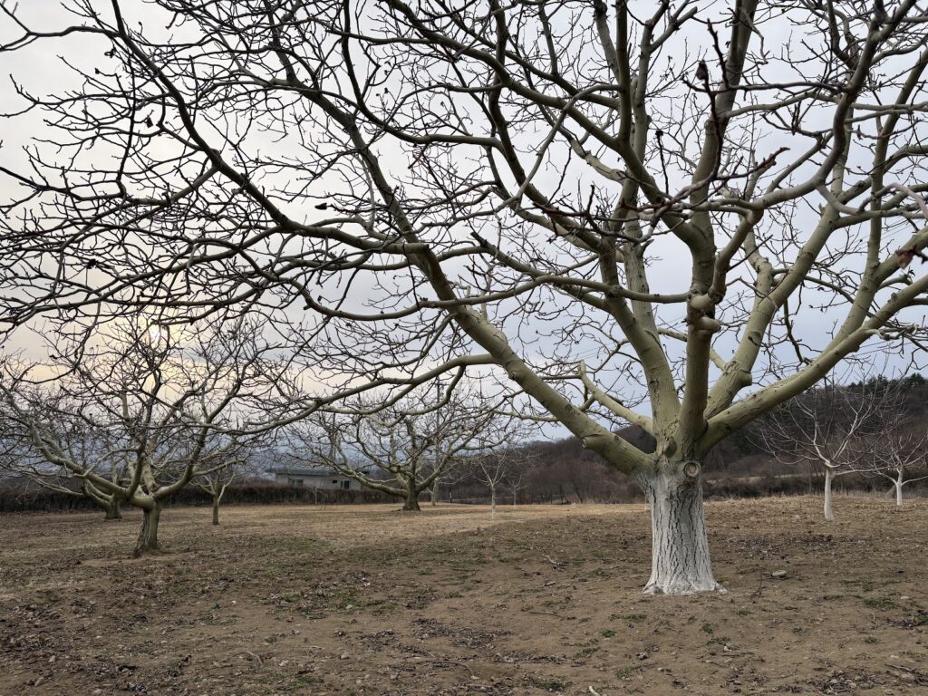 すべらかな白っぽい枝は幹ほど太く、収穫しやすいように、光を無駄なく受けとれるように、低い位置から横に広がっていました。いくつもの剪定の跡もごつごつした樹形となって風格を感じさせます。木の根が水分や養分を吸い上げ、花、実をつける。人間がいただき、人間が手をいれる。