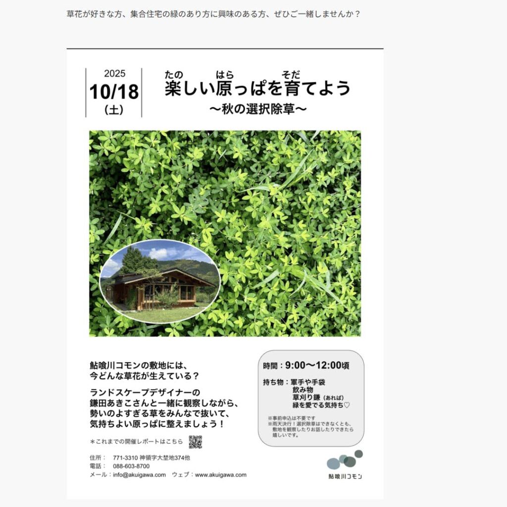 鮎喰川コモン 秋の選択除草のお知らせ NEWS 2025.09.17 2025年10月18日(土)9時~12時。秋は一般の方向けの企画となるようです。町にお住いの方、集合住宅にお住いの方、お子さんがいつも遊びに来ている方にお会いできると嬉しいです。 back to list