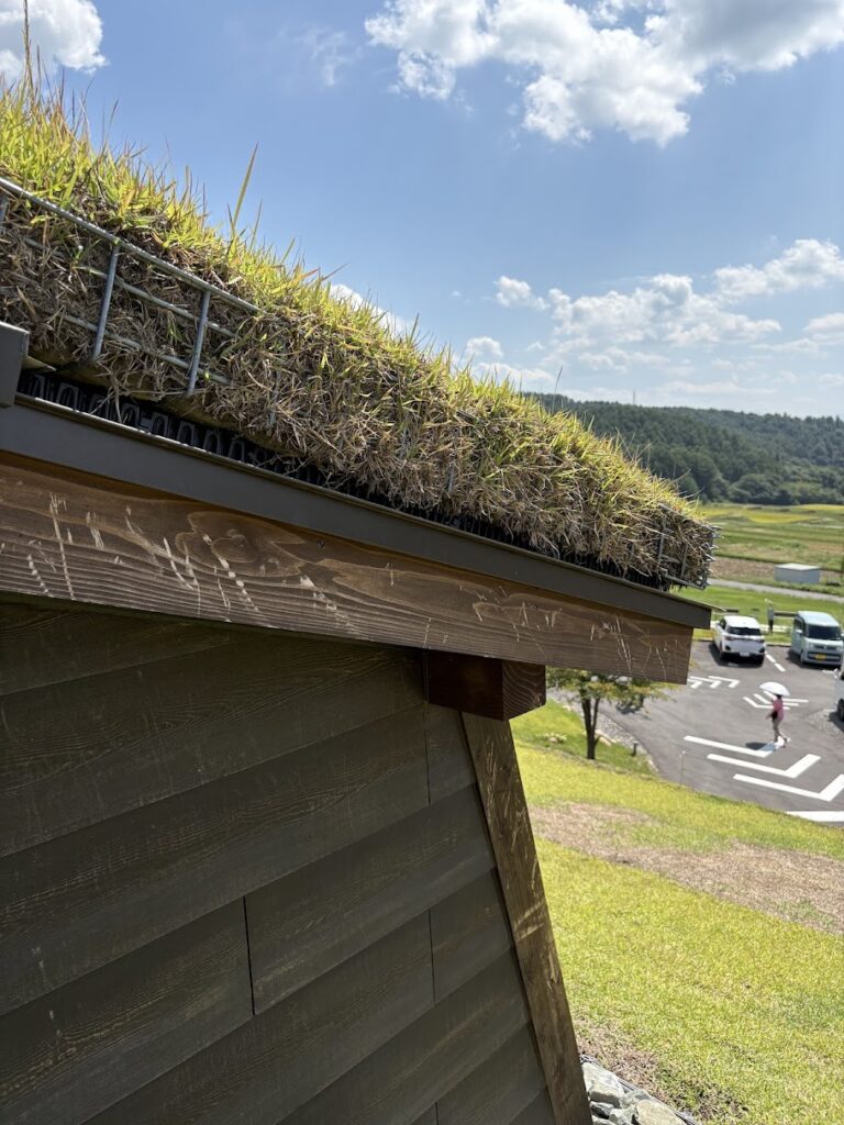 草屋根mtg with 3ヤギ BLOG 2025.09.18 草屋根の上で現場会議がありました。ヤギも一緒に来て草を食べています。おいしい草をはむはむするために上の棟にも首を伸ばしているそうです。木部にはガリッと手をかけた跡がたくさんありました。 草屋根施工を担当されたイケガミさんも一緒にご確認いただきました back to list