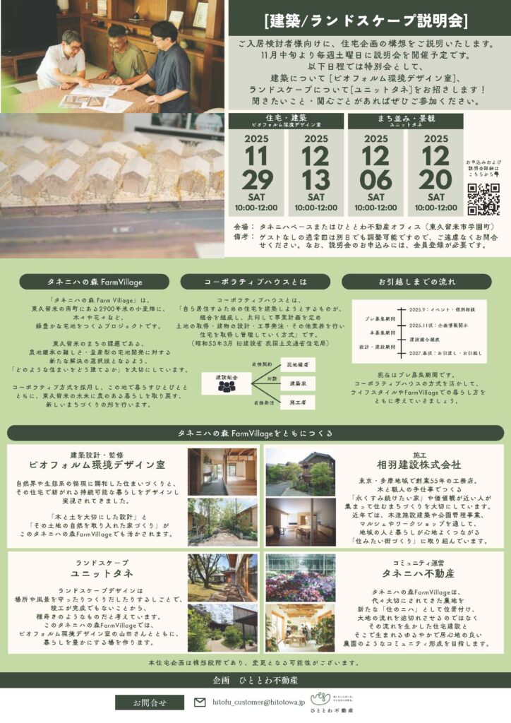 既にinfoに掲載済みですが、チラシがありましたので再び投稿します。ランドスケープ説明は、次回で最終の12/20(土)となっています。前回もですが、次回も初めて参加の方中心となりそうなので、土地の周辺を歩いたりなどして、暮らすイメージが湧いてくるようなイベントになるのかしらと思います。
